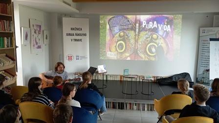 Aj tentoraz si oddelenie pre deti pozvalo v rámci cyklu Kniha a ešte trochu viac do záhradnej čitárne zaujímavého hosťa, ktorým bol 12. marca spisovateľ, učiteľ a bývalý reprezentant v šerme Dávid Králik. Je známy najmä svojím inovatívnym prístupom k vzdelávaniu a tvorbou pre deti, kde sa zameriava na rozvíjanie detskej fantázie a kreativity. Sám seba niekedy označuje ako „spisovateľa, ktorý lieta v papučiach“. Dávid je autorom či spoluautorom viacerých knižiek a stretnutie so žiakmi piateho a šiesteho ročníka ZŠ Atómová sme zamerali na knihu s názvom PuRAViDA. Ide o dobrodružný a zároveň hlboký príbeh určený deťom. Náš sympatický, energický a veselý hosť najskôr odprezentoval svoje putovanie po Kostarike, na základe ktorého aj čerpal námety na napísanie knižky PuRAViDA. Žiakom následne prečítal z nej úryvok, zahral a zaspieval piesne na gitare a takisto si pre deti pripravil aj tvorivú časť, v ktorej kreslili hlavnú postavu knižky tukana a vypĺňali poučnú aktivitu s názvom SKOČ - Situácia, Konanie, Ovplyvnenie, Činnosť.