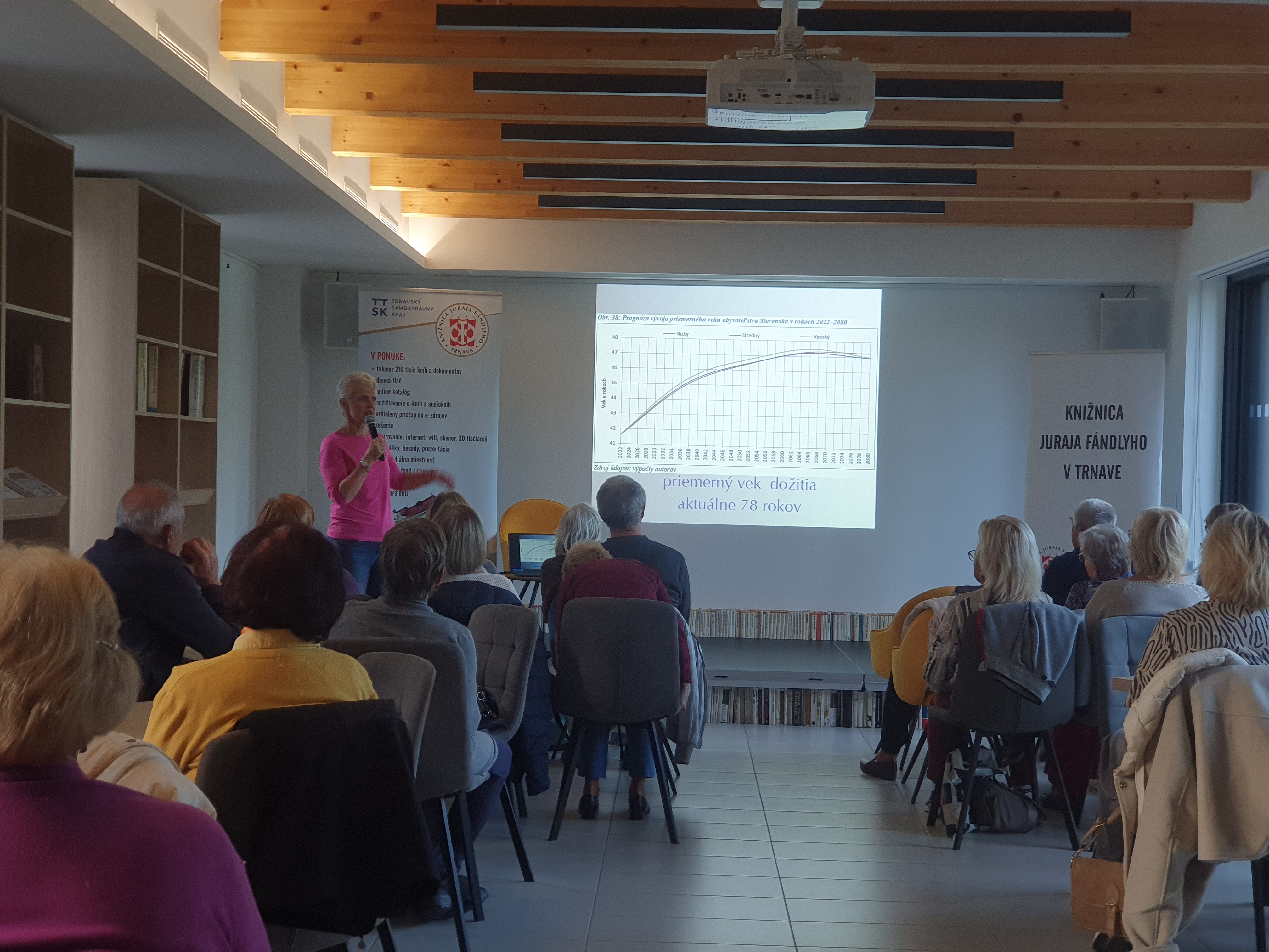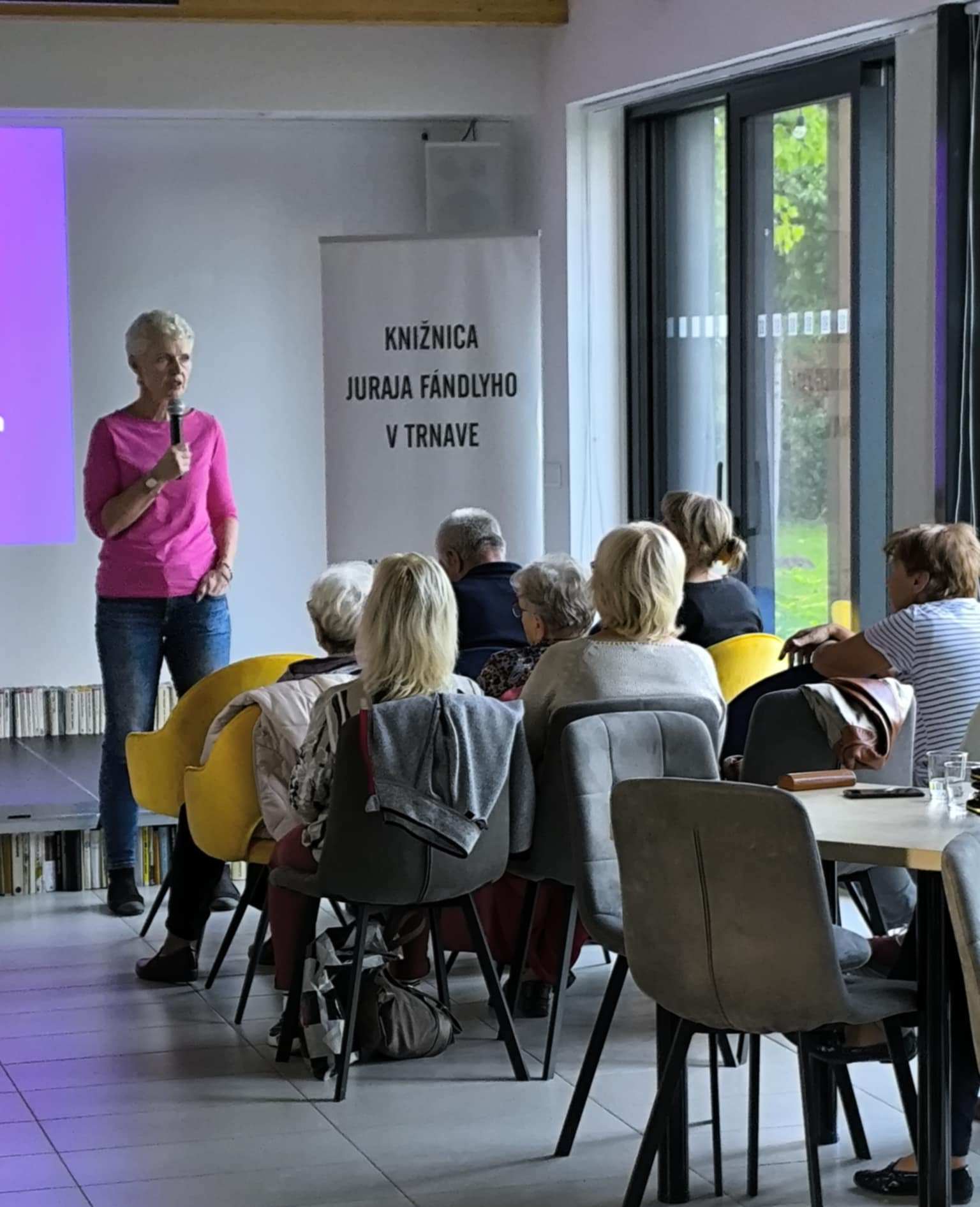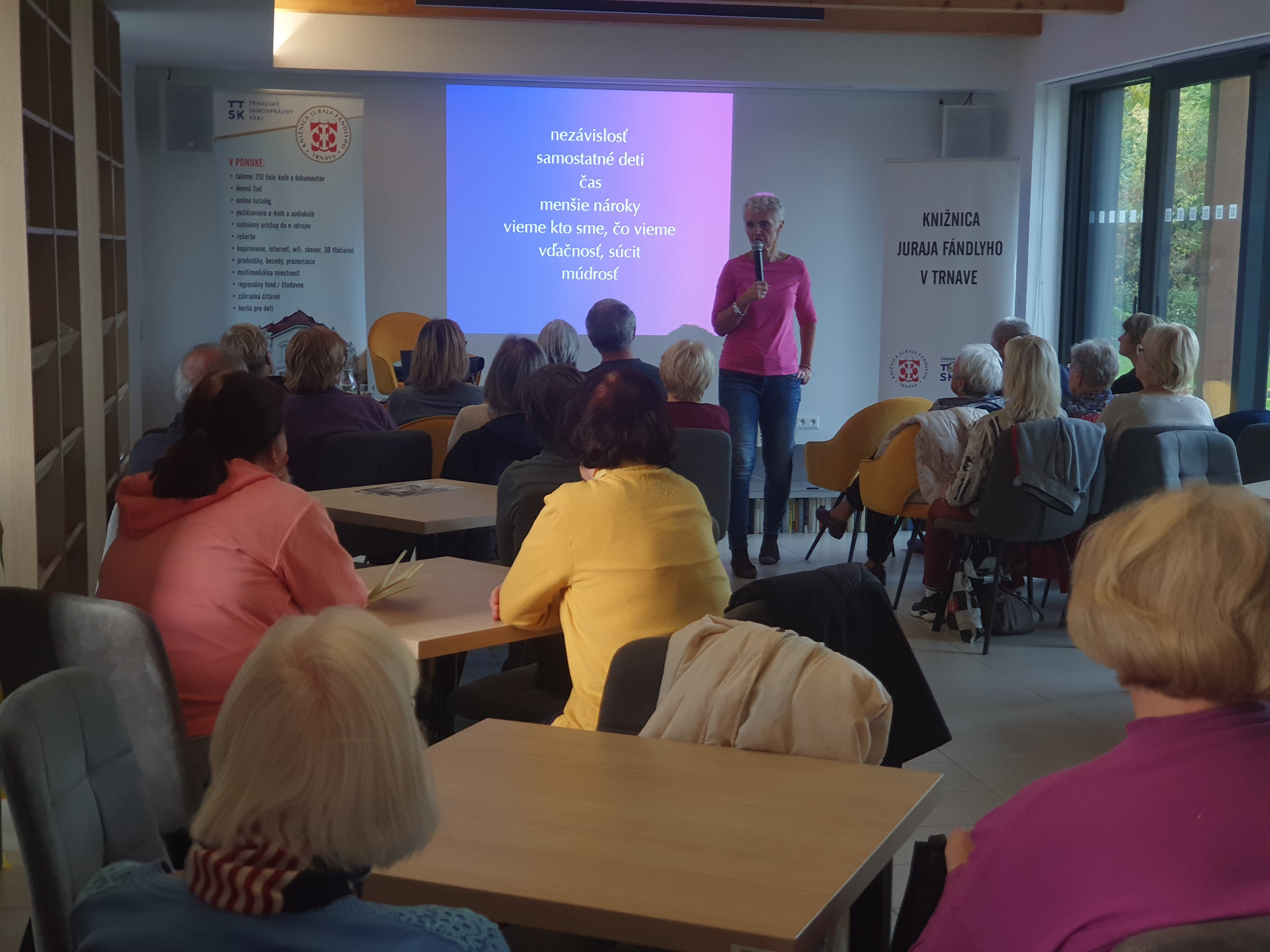 Dňa 8. októbra 2025 sa v záhradnej čitárni Knižnice Juraja Fándlyho v Trnave v spolupráci s Trnavským samosprávnym krajom v rámci cyklu venovaného seniorom Dvere kultúry dokorán, uskutočnilo inšpiratívne podujatie s názvom Starnutie a vitalita. Hosťom stretnutia bola Liba Chiara Hladeková, certifikovaná lektorka a koučka pre osobný rozvoj, trénerka pamäti a jogy smiechu, ktorá sa dlhodobo venuje témam duševnej pohody, zdravého starnutia a sebapoznania. Podujatie bolo zamerané na pozitívny prístup k procesu starnutia, na udržiavanie psychickej i fyzickej vitality a na objavovanie možností, ako si aj v zrelom veku uchovať radosť, energiu a chuť do života. Príjemná atmosféra záhradnej čitárne, otvorená diskusia a aktívna účasť návštevníkov prispeli k tomu, že stretnutie sa nieslo v duchu pohody, vzájomného porozumenia a humoru. Účastníci ocenili najmä praktické rady a jednoduché tipy, ako podporiť svoju vitalitu v každodennom živote – prostredníctvom pohybu, vedomého dýchania, pozitívneho myslenia a sociálnych kontaktov.