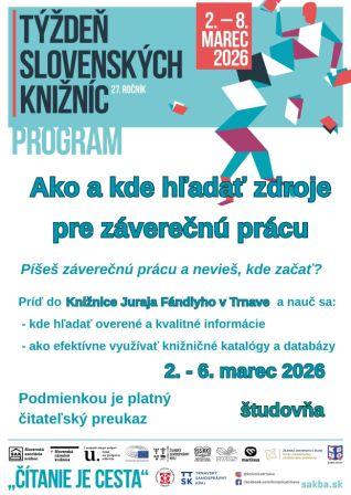 V rámci Týždňa slovenských knižníc 2026 ponúkame študentom pomoc pri vyhľadávaní literatúry v elektronických informačných zdrojoch k záverečným prácam.