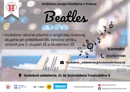 John Lennon, Paul McCartney, George Harrison a Ringo Starr. Snáď všetkým sú známe tieto mená. Kto z mladšej generácie o legendárnych Beatles ešte nevie, môže sa dozvedieť v hudobno-slovnom pásme, ktoré ponúka pri príležitosti 65. výročia vzniku tejto anglickej rockovej skupiny hudobné oddelenie. Určené je pre 2. stupeň ZŠ a študentov SŠ.