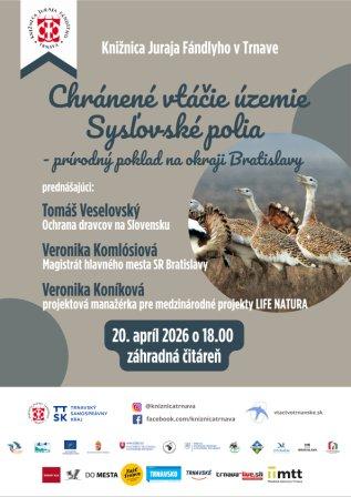 V spolupráci so Slovenskou ornitologickou spoločnosťou vás pozývame na prednášky odborníkov na tému: Chránené vtáčie územie Sysľovské polia - prírodný poklad na okraji Bratislavy.