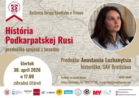 Pozývame vás na prednášku s historickou témou. Prednášať bude historička a pracovníčka Historického ústavu SAV v Bratislave Anastasiia Luzhanytsia. Témou jej výkladu budú Dejiny Podkarpatskej Rusi. Podkarpatská Rus, územie na západe dnešnej Ukrajiny, je kraj s krásnou prírodou a bohatou históriou. Historička priblíži pohnuté dejiny tohto regiónu.