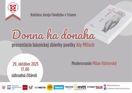 V stredu 29. októbra bude hostkou Knižnice Juraja Fándlyho v Trnave poetka s osobitým rukopisom a štýlom Ala Mlčoch, ktorá v záhradnej čitárni bude prezentovať svoju novú knihu Donna ha donaha. Ide o osobitú výpoveď, ktorá zaujme slovnými hračkami a bohatým metaforickým jazykom.