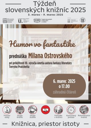 Medzi podujatia Týždňa slovenských knižníc je zaradená aj prednáška Milana Ostrovského pri príležitosti 10. výročia úmrtia anglického autora fantasy literatúry Terryho Pratchetta ( 28. 4. 1948 – 12. 3. 2015). Kto o tomto spisovateľovi vie, že obľuboval rôzne extravagantné pokrývky hlavy a že mu kráľovná Alžbeta II. udelila za zásluhy v literatúre Rad britského impéria, vie stále málo. Máte však príležitosť získať nové poznatky od fundovaného odborníka na fantasy literatúru. A ešte sa aj pobaviť.