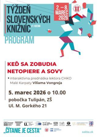 V rámci Týždňa slovenských knižníc ponúkame interaktívnu prednášku lektora CHKO Malé Karpaty Viliama Vongreja. Viliam Vongrej je nielen miestny znalec obojživelníkov a plazov, ale aj zoológ a ekovýchovný pracovník na Správe CHKO Malé Karpaty. Do pobočky na Tulipáne príde malým knihomoľkom porozprávať, čo sa stane, keď sa zobudia netopiere a sovy.