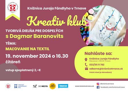 V novembri je na programe maľovanie na textil. Rezervujte si miesto už teraz: osobne, telefonicky: 033/5511782 alebo emailom: odborne@kniznicatrnava.sk