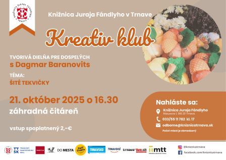 Pravidelné stretávanie členiek Kreativ klubu, ale samozrejme aj nových záujemcov či záujemkýň, prináša nielen spoznanie nových techník, ale aj radosť z tvorby, podporu kreativity a aj nadväzovanie nových priateľstiev. To všetko pod dohľadom lektorky Dagmar Baranovits.