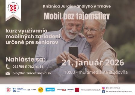 V januári začíname nový kurz pre seniorov, ktorí si chcú zlepšiť svoje zručnosti v ovládaní mobilu. Privítame všetkých, ktorí sa chcú niečo nové naučiť, či sa len zdokonaliť v digitálnych technológiách. Je potrebné sa prihlásiť: bio@kniznicatrnava.sk alebo 033/5511782, kl.14. Podmienkou účasti platný čitateľský preukaz.