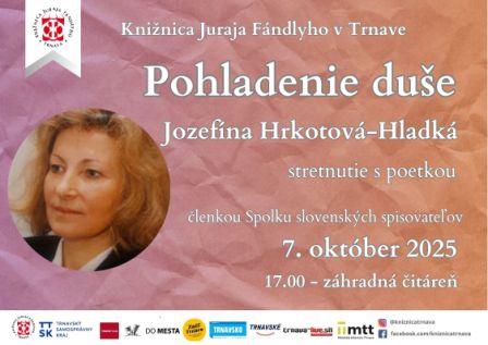 Pozývame vás na stretnutie s poetkou Jozefínou Hrkotovou-Hladkou, členkou Spolku slovenských spisovateľov. Žije a pôsobí v Novom meste nad Váhom a úspešne prezentovala svoju poéziu aj na Medzinárodnom literárnom stretnutí v Nemecku – v Überlingene, kde v jej podaní znela nielen nemecká, ale aj slovenská reč. Cez poéziu prináša pohľad na svet, na vzťahy a veci v ňom, ktoré majú raz váhu bremena, raz váhu ľahkého pierka. Veríme, že stretnutie s jej veršami bude krásnym pozastavením v dnešnej uponáhľanej dobe.