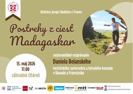 Vydajte sa s nami v rámci cyklu Postrehy z ciest po stopách tajuplných potomkov Bornea, po stopách Mórica Beňovského, nepísaného kráľa Madagaskaru, po desiatej najchudobnejšej krajine sveta, v ktorej však francúzska kultúra a gastronómia zanechala svoj neuveriteľný šarm a vplyv. Pozývame vás na návštevu MADAGASKARu, ostrova v Indickom oceáne. Sprevádzať vás bude diplomat, sprievodca a cestovateľ Daniel Belanský. Pôsobil dlhé roky na našich zastupiteľských úradoch v Paríži, Ottawe a Nikózii ako konzul Slovenskej republiky, v záhradnej čitárni sa predstaví ako skúsený cestovateľ.