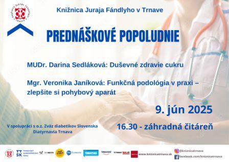 Naši návštevníci a návštevníčky si už zvykli na pravidelné odborné prednášky z rôznych vedných oblastí, ktoré im ponúkame v našej záhradnej čitárni. V spolupráci s občianskym združením Zväz diabetikov Slovenska a Diatyrnavia Trnava ponúkame zdravotnícke témy s naozaj výnimočnými prednášajúcimi.
