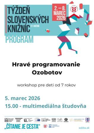 V Týždni slovenských knižníc sme pripravili niečo aj pre malých programátorov. A síce workshop programovania malých robotov - tvorivú dielňu pre deti zameranú na digitálne zručnosti. Privítame všetkých 7+, ktorí sa chcú niečo nové naučiť, či sa len zdokonaliť v digitálnych technológiách. Pomocou farebných kódov, línií a jednoduchých príkazov sa deti naučia robotov viesť po dráhe, riešiť úlohy a vytvárať vlastné mini projekty.