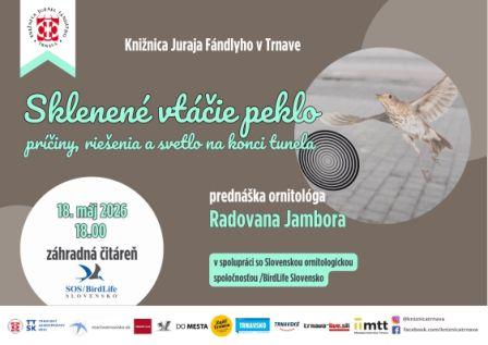 V spolupráci so Slovenskou ornitologickou spoločnosťou / BirdLife Slovensko vás pozývame na prednášku ornitológa Radovana Jambora, ekológa a ochranára. Venuje sa problematike urbánnej ekológie a ochrany vtáctva v mestách. Ako autor a spoluautor má na konte niekoľko odborných publikácií a prác venovaných vtáctvu, realizuje osvetové a edukačné podujatia o vtáctve, založil Ornitologickú poradňu. Angažuje sa napríklad pri riešeniach ako predchádzať kolíziám vtákov so sklenenými bariérami v krajine, ktoré sú považované za jednu z najčastejších príčin ich úhynu pri preletoch a migrácii, alebo pri humánnom odchyte holubov. Je zástancom aj poznávacej turistiky, v rámci ktorej sa snaží propagovať ekologicky významné miesta v prírode.