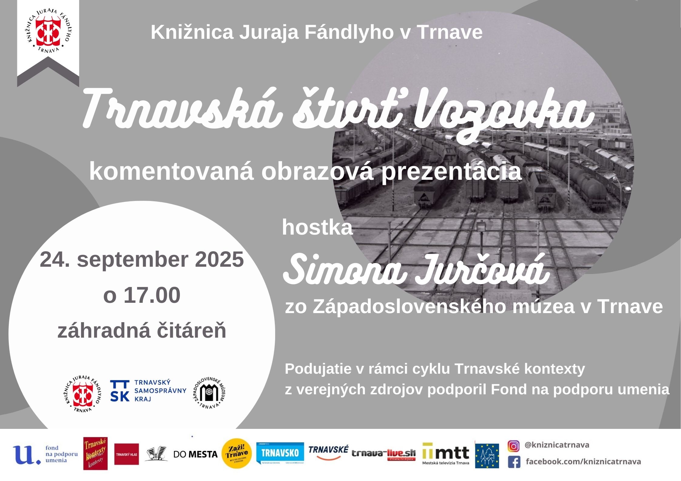 PaedDr. Simona Jurčová patrí k obľúbeným hostkám Knižnice Juraja Fándlyho v Trnave. Naposledy sme sa s ňou mali možnosť stretnúť v máji t. r, keď nám rozprávala o trnavských trhoch a jarmokoch. V stredu 24. septembra sa s ňou môžete uvidieť a počuť opäť, ak prijmete pozvanie na rozprávanie o trnavskej štvrti Vozovka, ktorá v Trnave vznikala od dvadsiatych rokoch 20. storočia v súvislosti so vznikom závodu na opravu železničných vagónov. Vedeli ste, že Hotel Kriváň s reštauračným zariadením bol postavený už okolo roku 1930? Alebo, že práve pri Vozovke vznikol Robotnícky spevokol Bradlan, ktorý práve v tomto roku oslávil 95. výročie svojho vzniku? Aj takéto informácie sa môžete dozvedieť z komentovanej obrazovej prezentácie v záhradnej čitárni knižnice.